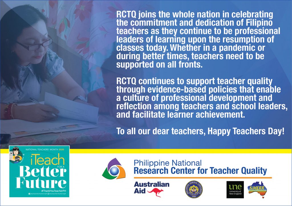 RCTQ joins the whole nation in celebrating the commitment and dedication of Filipino teachers as they continue to be professional leaders of learning upon the resumption of classes today. Whether in a pandemic or during better times, teachers need to be supported on all fronts.