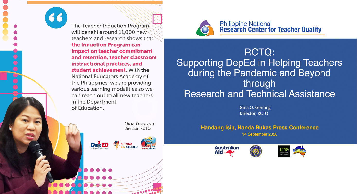 Dr. Gonong talked about RCTQ’s work on the the standards-based career progression and performance management system, which helps teachers adapt and respond more quickly to circumstances associated with the COVID-19 pandemic, the implementation phase of the transformation of the National Educators Academy of the Philippines (NEAP), including the development of the Teacher Induction Program (TIP) for new teachers.