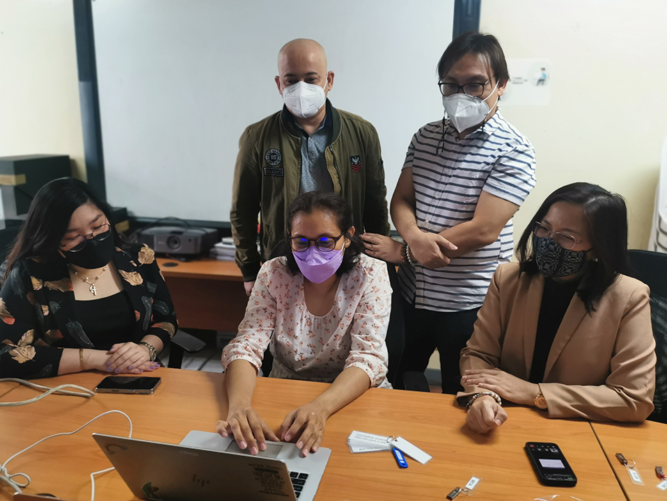 DepEd Directors Dr. Jennifer Lopez (seated, right) and Ms Nina Bianca Sanglay (seated, left) test the contents of the NQESH flash drives assisted by BHROD staff Fatima B. Angeles (seated, middle) while RCTQ senior program managers Dr. Elipane and Dr. Anudin look on.