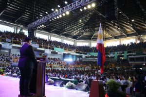 Mr. Nigel Bruce speaks before thousands at the launch of PPST at the Ibalong Centrum for Recreation, Legazpi City.